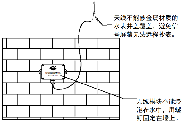 2. 模塊不能浸泡在水中,安裝時(shí)用螺釘固定在牢固墻面,引出天線不能被金屬材質(zhì)的水表井覆蓋,避免信號(hào)屏蔽無法遠(yuǎn)程抄表。
